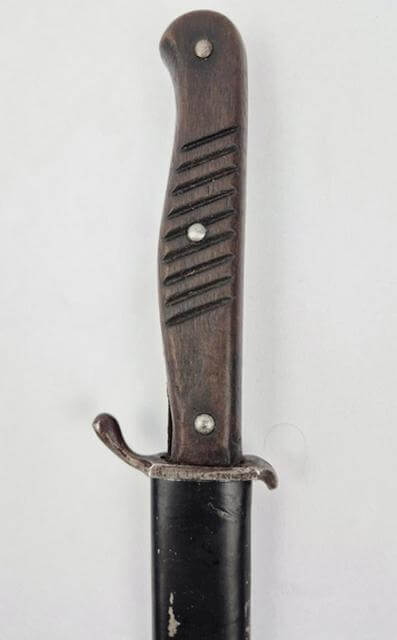 Complete with a metal scabbard, the clasp for the leather carrying loop is missing.