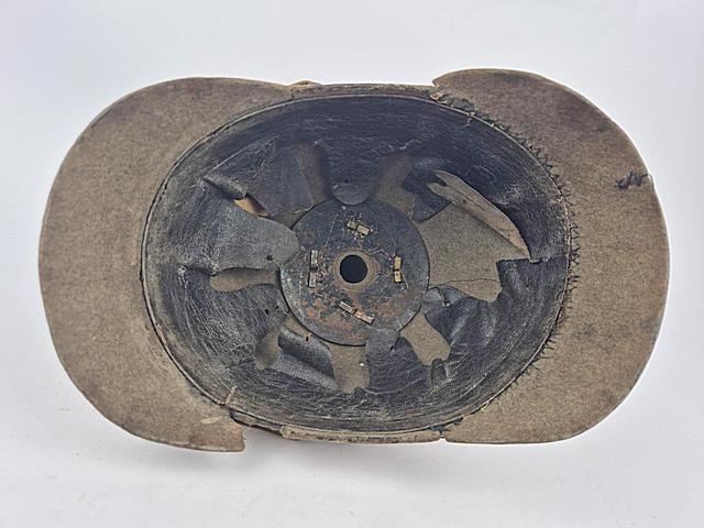 However, the helmet is fitted with a rare cloth fabric chin strap which was also damaged and has been lightly repaired.