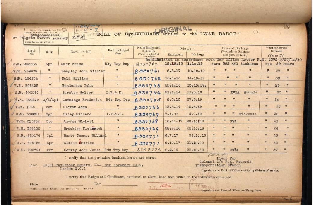 This number belonged to Spr (Sappeur) John William Beagley of the Royal Engineers, who enlisted on March 6, 1917, and was discharged due to sickness in 1919.