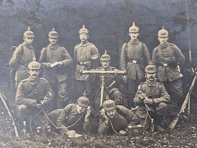Beautiful original photo of IR405 enlisted men equipped with telephones, Mithörers, and binoculars.