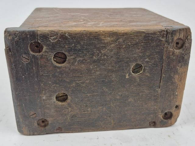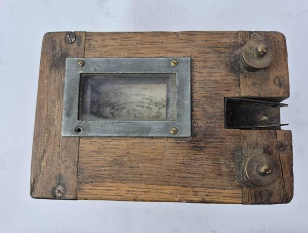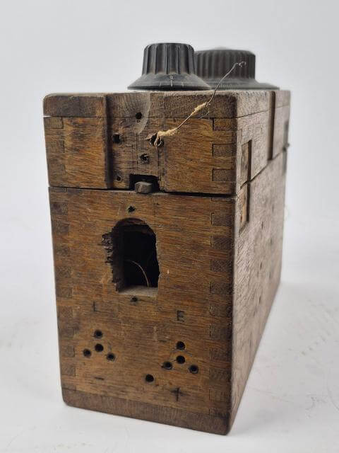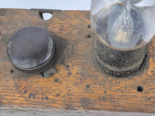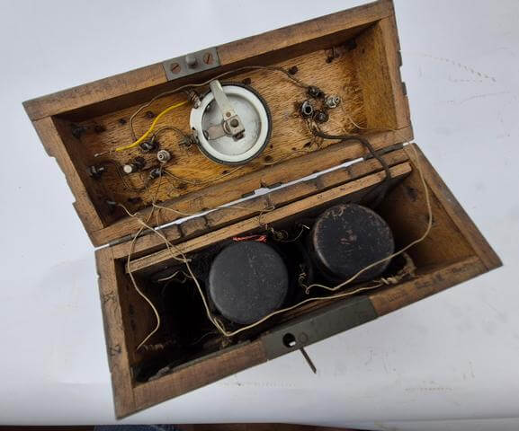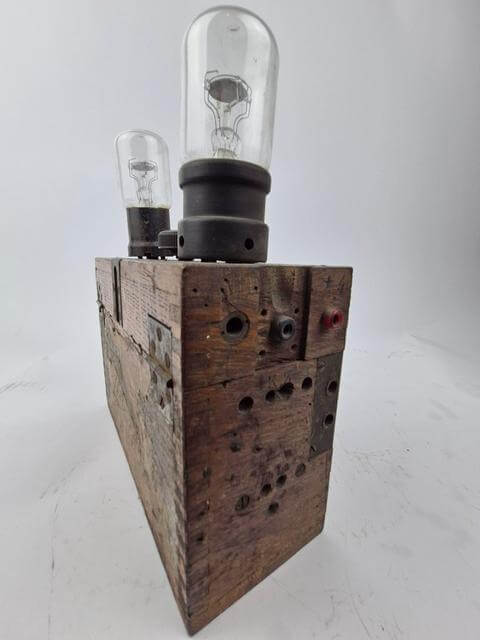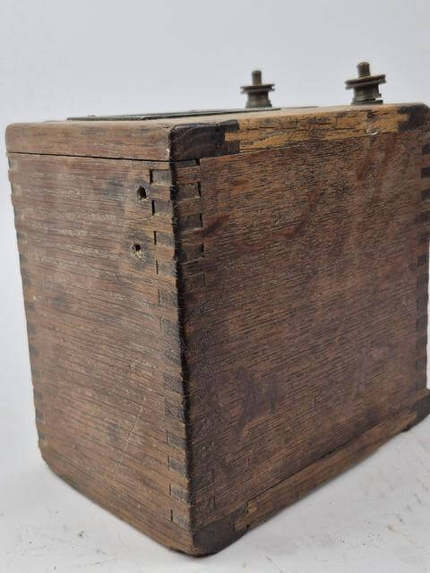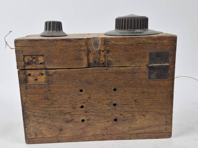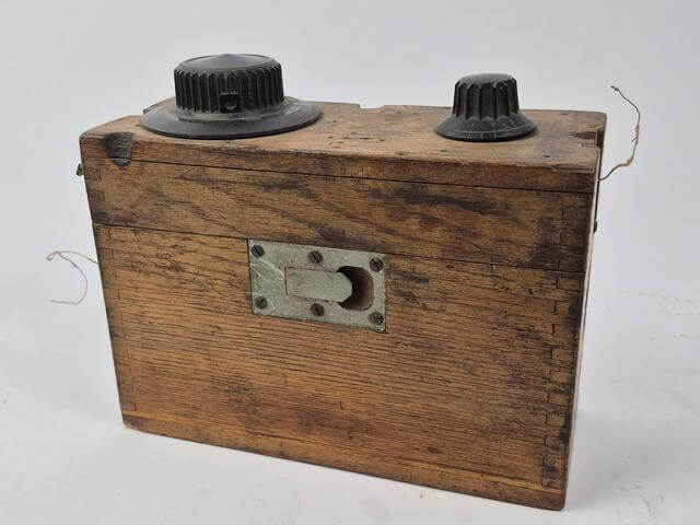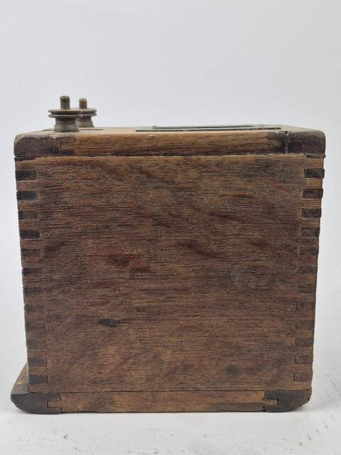 Bakelieten draaischijf met wijzer in het midden en twee langwerpig ronde batterijen gemonteerd op een stuk hout aan de binnenkant.