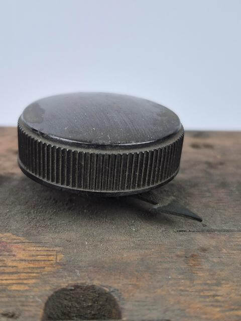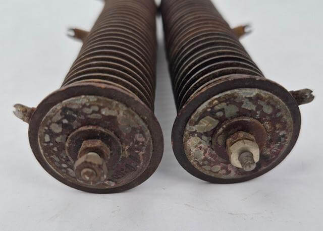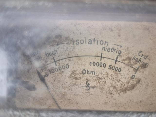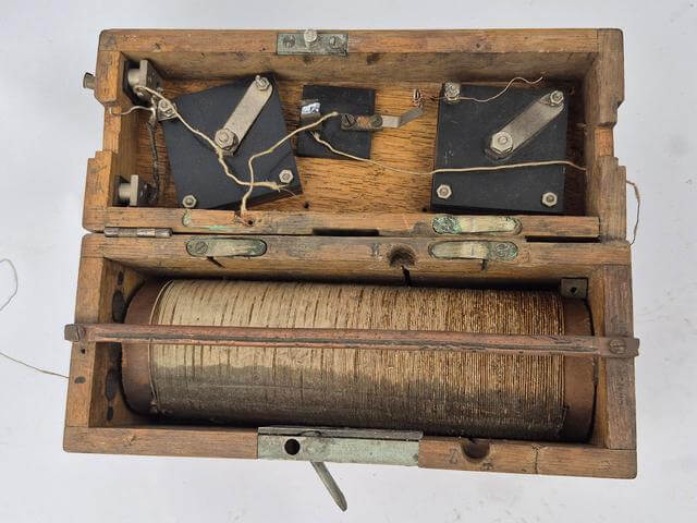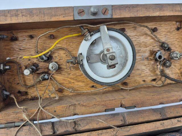 Een kast met grote bakelieten draaischijf lopend van 0 tot 100 en een kleine van 0 naar 10 en met een grote spoel van binnen.