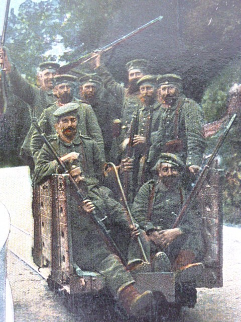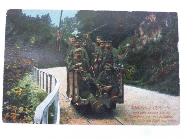 AK, Weltkrieg 1914-16 “Infanterie kommt auf der Kleinbahnaus der Stellung…..”.
