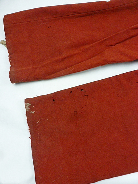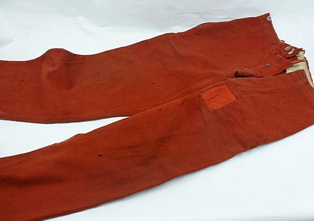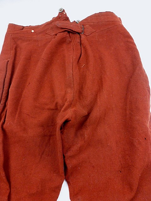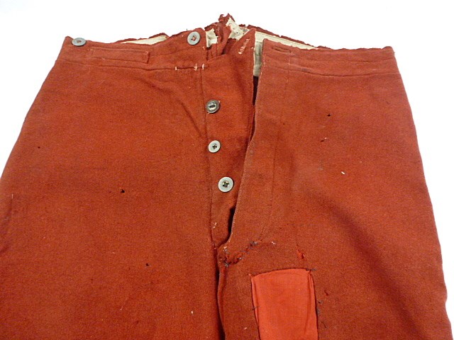 De broek is in matige conditie met verschillende motgaten en een reparatie aan de voorzijde.