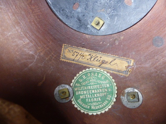 Tevens voorzien van een etiket met maat en naam; 57 1/2, Klügel en prachtig fabrikant etiket van H.Osang, Hoflieferant, Dresden in de Saksische kleuren.