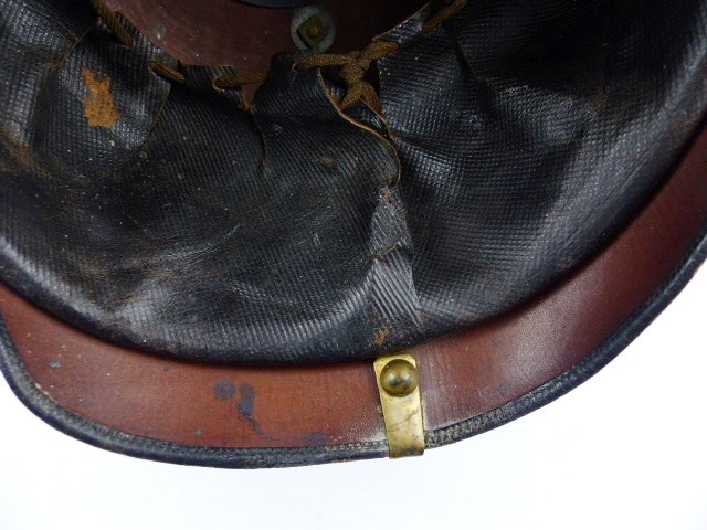 Mooie lederen helm met messing beslag en het wapen van Saksen met spreuk; Providentiae Memor.